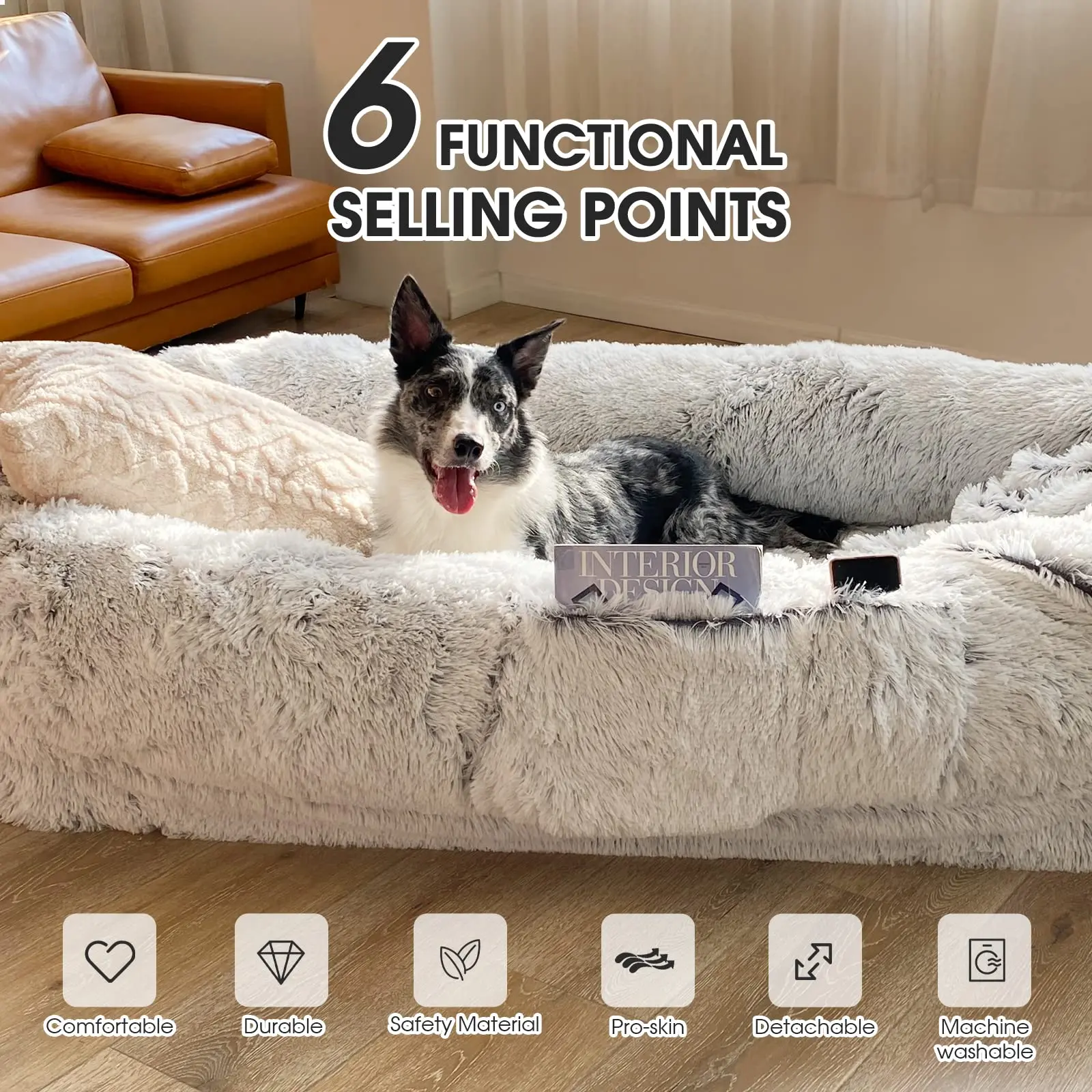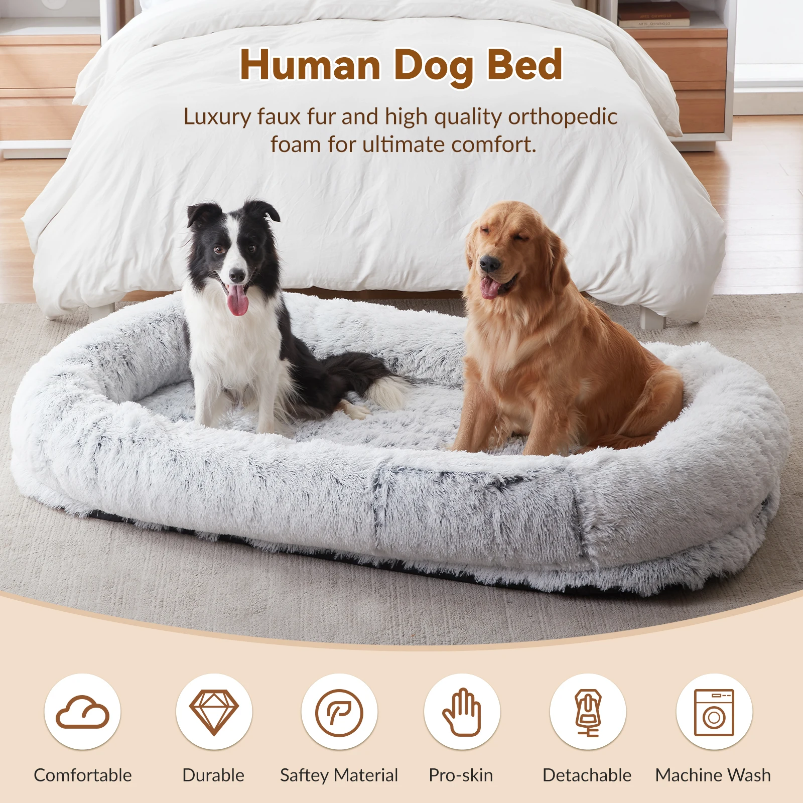 Soft faux fur cover, high-density orthopedic foam base, and supportive side bolsters for full-body comfort.