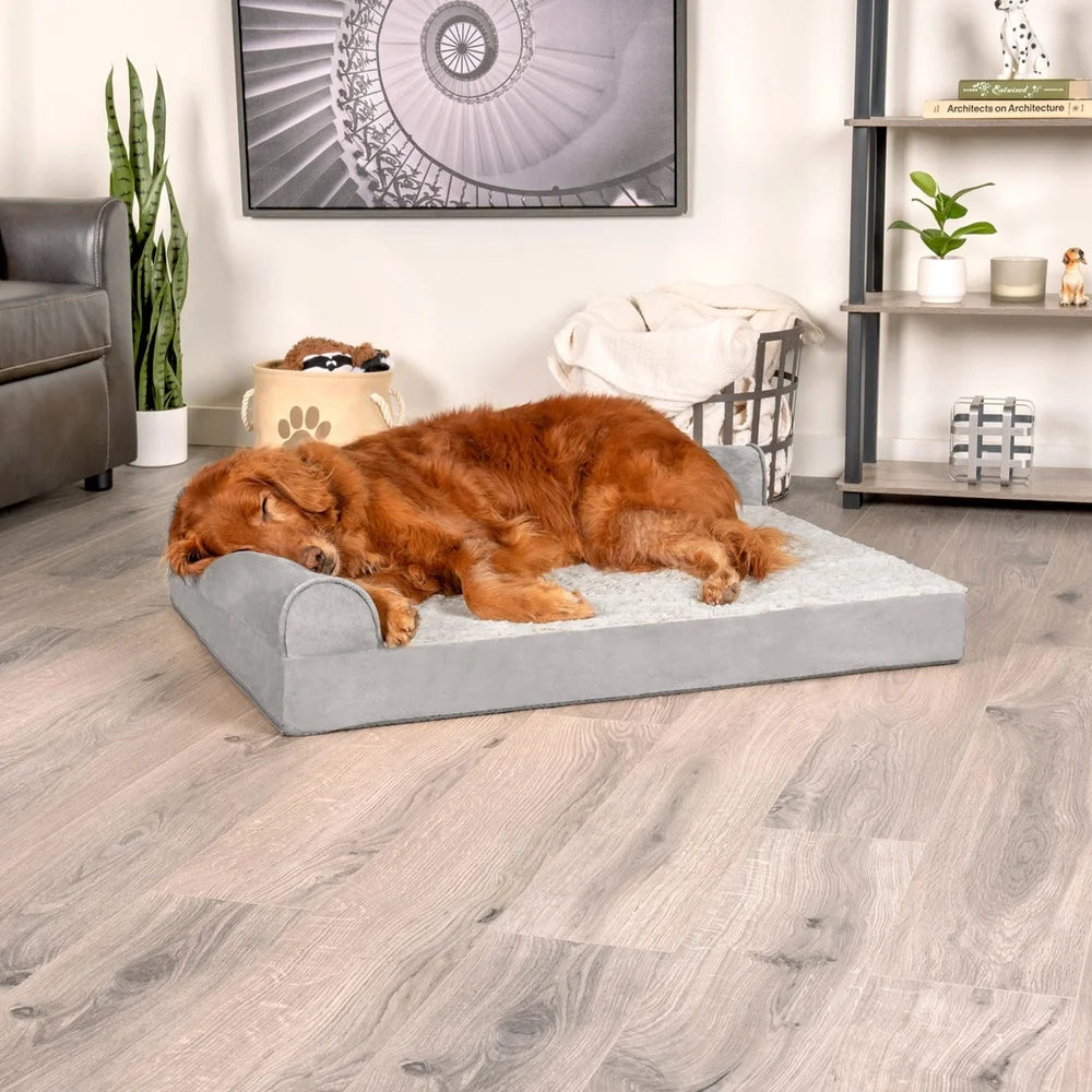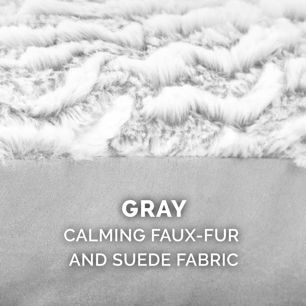Supportive orthopedic foam base, soft faux fur sleeping surface, and faux suede-covered bolsters for added durability and comfort.